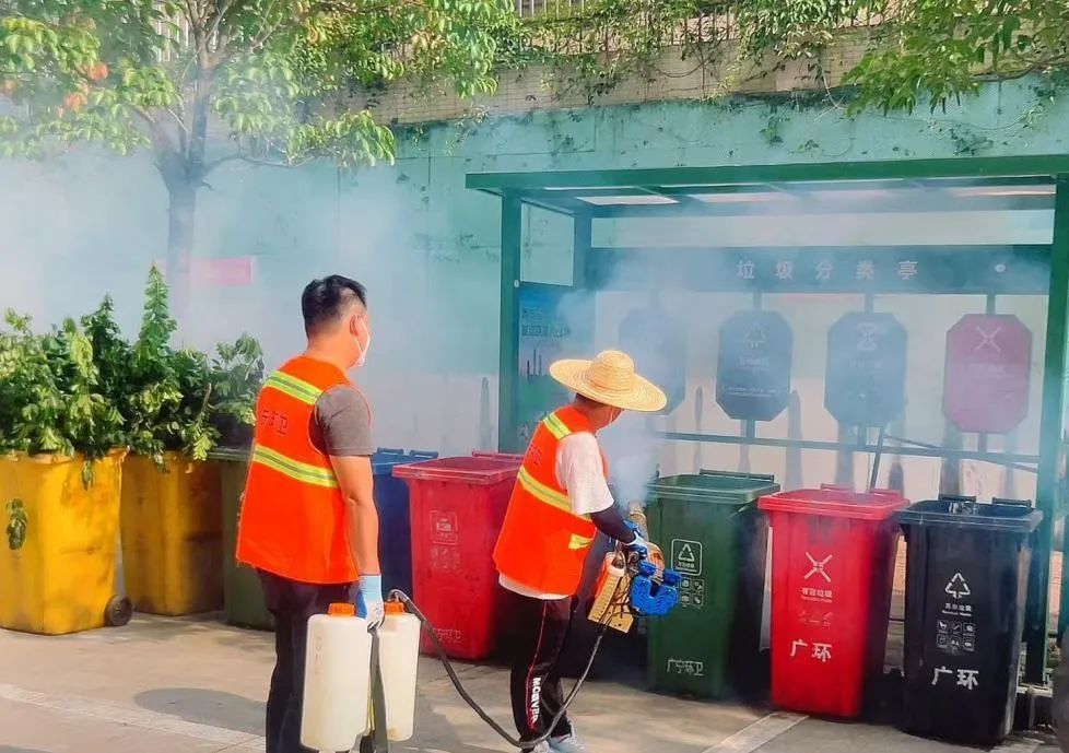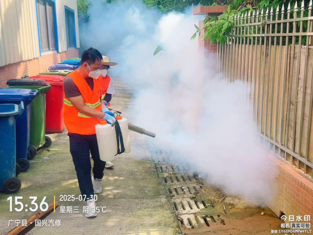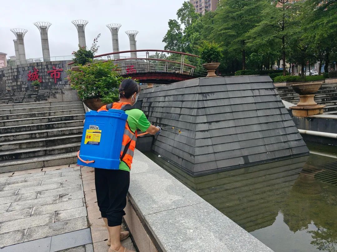 县城管局组织环卫所、园林所全面开展清洁清扫、防蚊消杀工作,针对垃圾中转站、公共厕所、垃圾收集点、下水道、卫生死角、公园广场、绿化带等蚊虫滋生的场所进行拉网式排查和清理,并使用专业消杀设备与安全高效的杀虫剂进行喷药消杀,实施全方位空间喷雾与滞留喷洒作业,确保从源头减少蚊虫滋生。